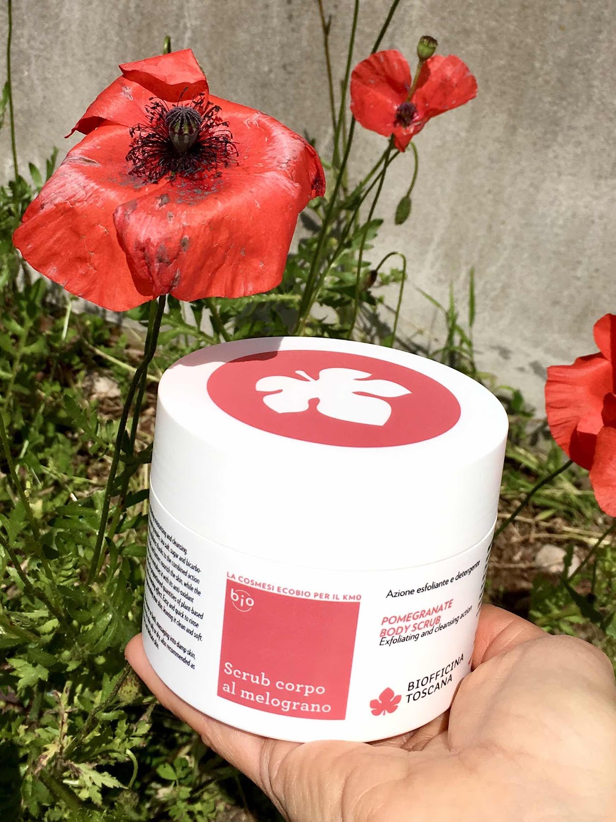 Esfolia delicatamente ed efficacemente grazie alla combinazione delle diverse granulometrie, gli oli e i burri nutrono la pelle, il succo bio di melograno toscano con proprietà antiossidanti la rivitalizza, grazie ai tensioattivi vegetali presenti in quantità misurata svolge anche una delicata azione detergente.